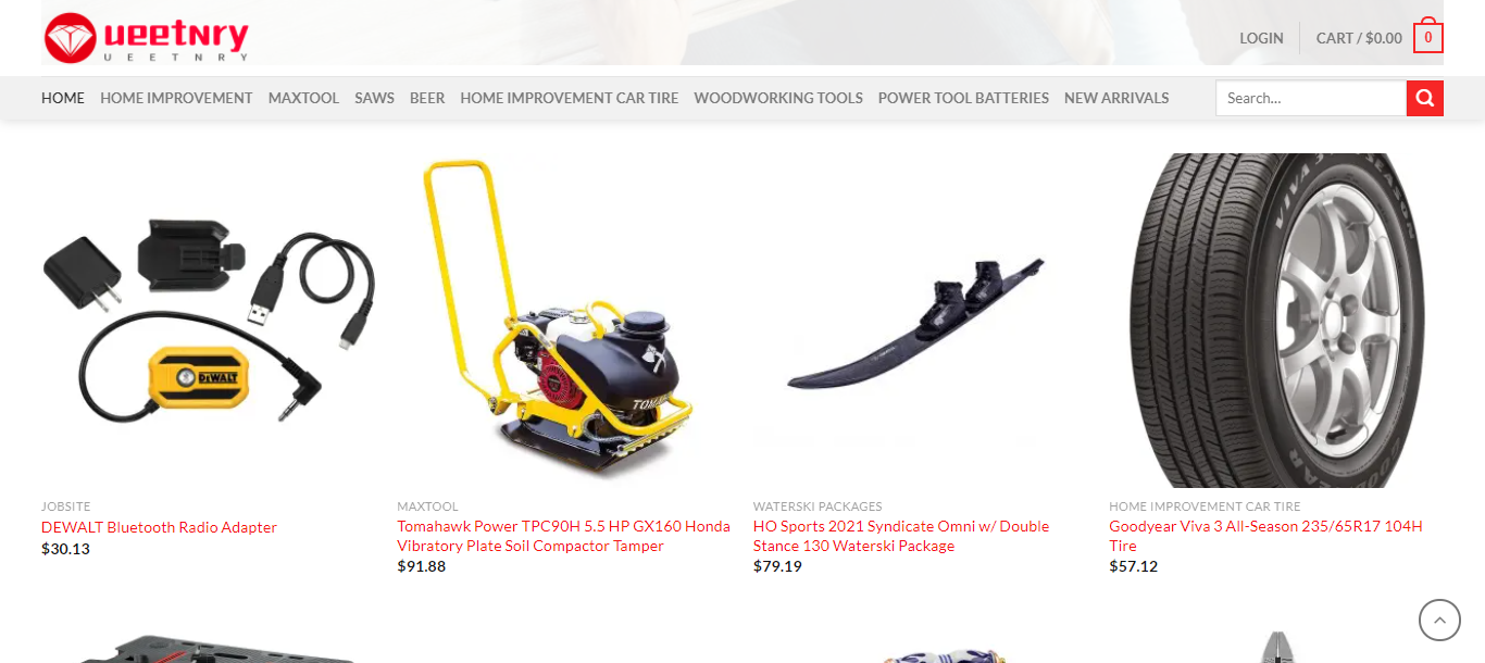 Ueetnry located at ueetnry.com is an online store that deals in various products such as DEWALT Bluetooth Radio Adapter, Milwaukee M12 12-Volt Lithium-Ion Cordless Bluetooth/AM/FM Jobsite Radio with Charger with M12 2.0Ah Battery, DEWALT TSTAK Stackable & Portable Bluetooth Radio & Charger Compatible with 12-Volt, 20-Volt & 60-Volt FLEXVOLT Batteries, Tomahawk Power TPC90H 5.5 HP GX160 Honda Vibratory Plate Soil Compactor Tamper, HO Sports 2021 Syndicate Omni w/ Double Stance 130 Waterski Package, Connelly 2021 Carbon V w/ Double Tempest Waterski & Boots Package, etc. And these products are being sold at suspicious discount prices.