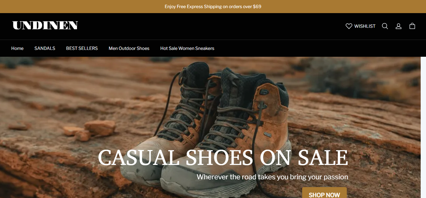 Undinen located at Undinen.com is an online store that is selling various types of shoes, etc, And these products are sold at a suspicious discount rate.