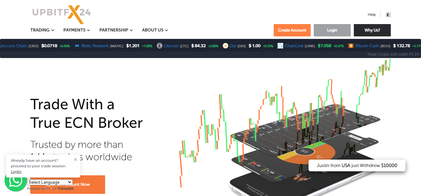 Upbitfx24 is a cryptocurrency exchange platform that claims to be a ECN/STP broker. They also claim that you can Enjoy low cost trading with spreads from 0.0 pips and commission from $1.50 per lot.