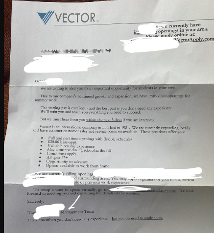 Vector Marketing is not a pyramid scheme in any way, shape or form. Vector Marketing is the sales and marketing division of Cutco. Vector reps are not responsible for recruiting new reps or buying any sort of product or service. In fact, Vector reps are independent contractors and they set their own schedules and have the opportunity to control how much they earn through a guaranteed base pay and commissions earned on each sale. Vector Marketing is also not a “get-rich-quick” scheme. Success is not guaranteed and it may take hard-work and dedication in order to succeed as a Vector rep.