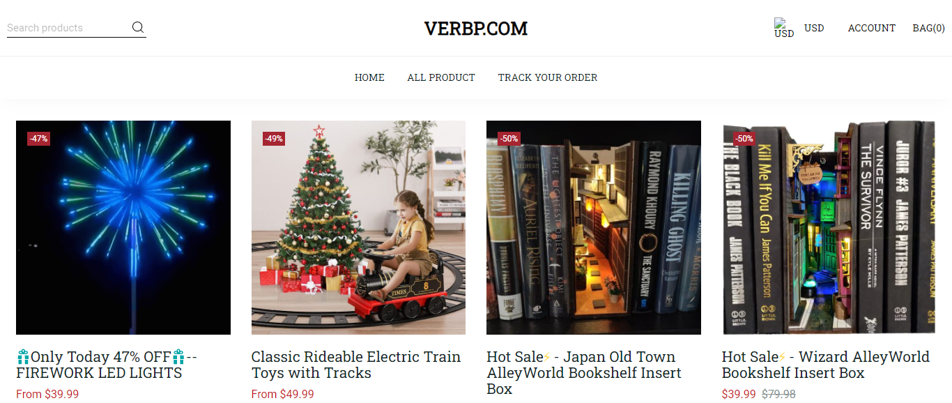 Verbp located at verbp.com is an online store that is selling various products such as FIREWORK LED LIGHTS, Classic Rideable Electric Train Toys with Tracks, Japan Old Town AlleyWorld Bookshelf Insert Box, Wizard AlleyWorld Bookshelf Insert Box, High-tech artificial intelligence robot, Working Lemarchand’s Lament Configuration Lock Puzzle Box from Hellraiser, Light Pong: CHRISTMAS TREE LIGHTSHOW, Light-Up Chicken with Scarf Holiday Decoration, Electric Climbing Santa, Sacred Christmas Wreath with Lights, Outdoor Christmas PVC inflatable Decorated Ball-Golden, National Lampoon’s Christmas Vacation Theme door hanger, etc. And these products are being sold at suspicious discount prices.