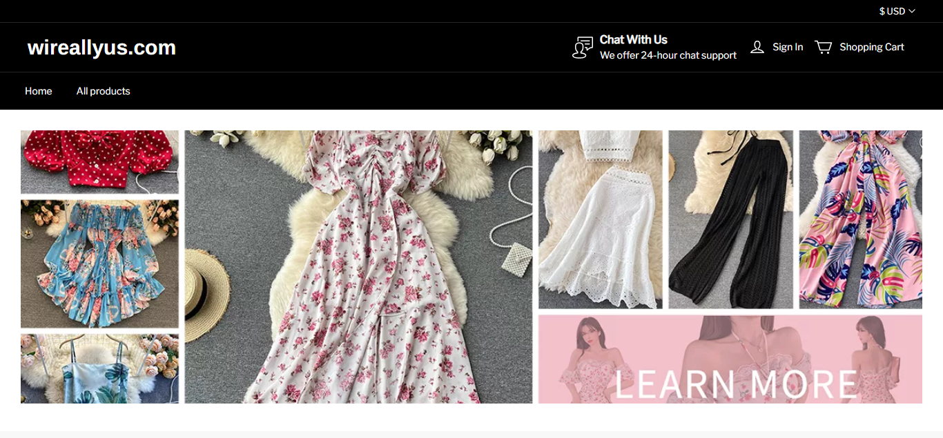 Wireallyus located at Wireallyus.com is an online store that claims to sell Amazon Pallets for only $34.97. It is also selling various types of clothings such as dresses, sandals, etc. And these products are sold at a suspicious discount rate.
