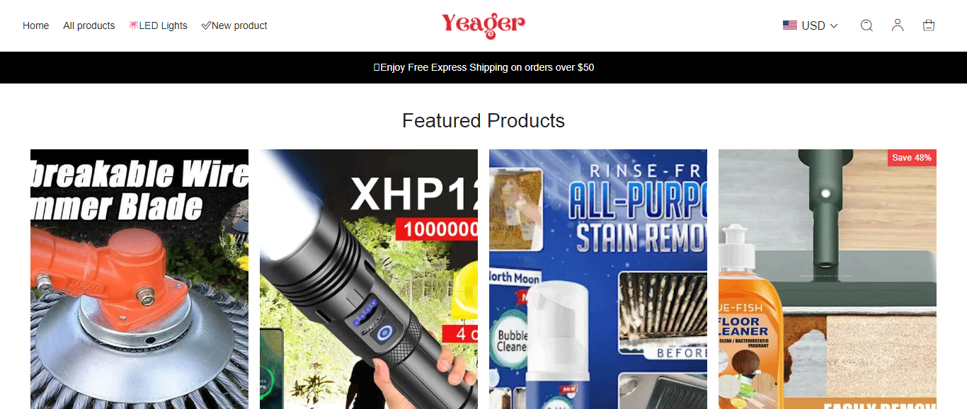 Yeager also known as Yeager Store located at Yeager.Store is an online store that is selling various products such as rinse free cleaning spray, LED Flashlight, floor cleaner, tooth repair granules, vegetable cutter, etc. And these products are sold at a suspicious discount rate.