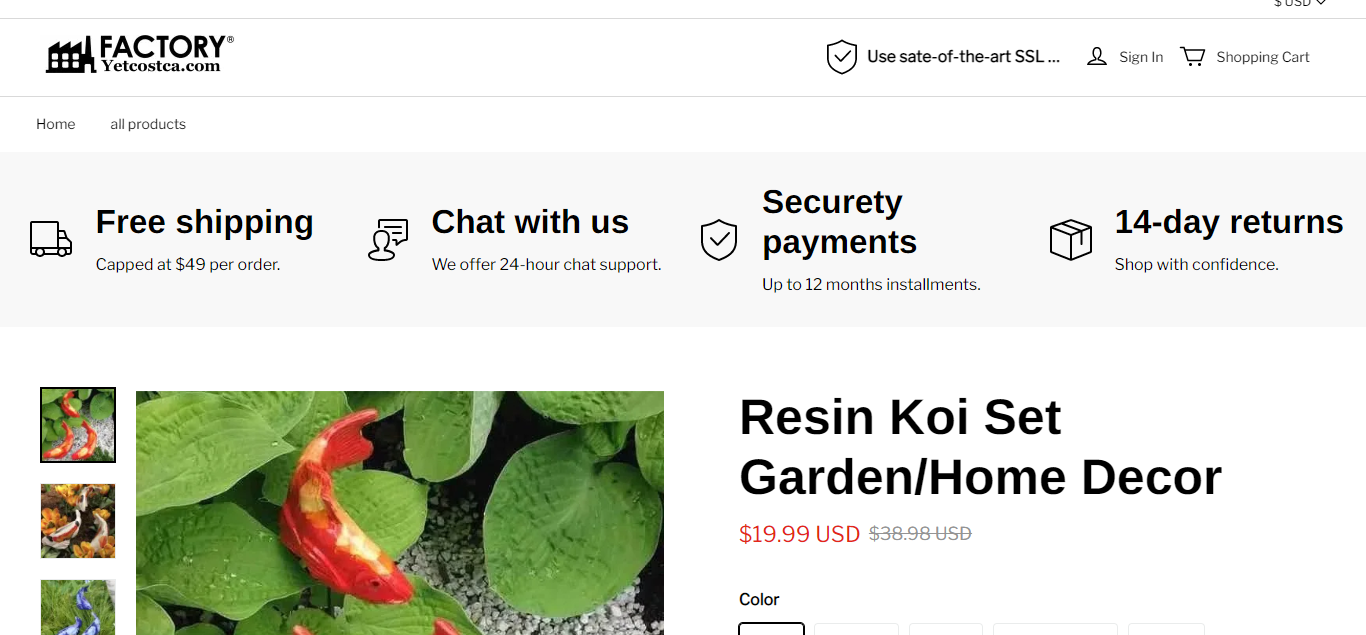 Yetcostca located at Yetcostca.com is an online store that is selling various products such as Resin Koi Set Garden decor, Resin parrot bird statue, etc. And these products are sold at a suspicious discount rate.