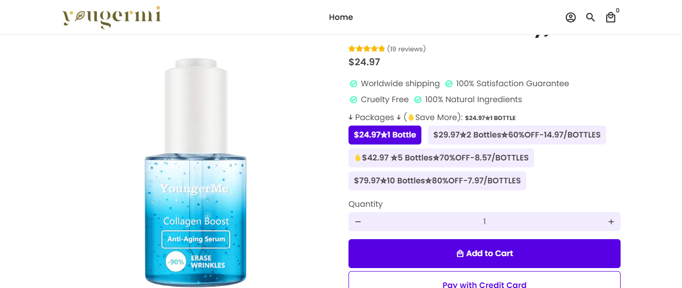 Sadly we do not think the Youngerme Collagen Serum works, most if not all the After pictures used are all fake, stolen from other skin care websites. There are also no customer reviews online about this product.