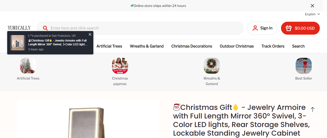 Yumically located at Yumically.com is an online store that is selling various products such as jewelry ammoire, wreaths, garlands, artificial trees, etc And these products are sold at a suspicious discount rate.